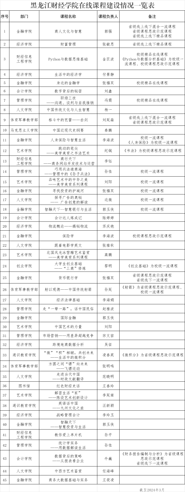 黑龙江财经学院在线课程建设情况一览表
