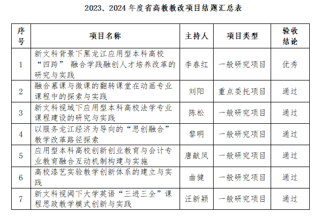 近日,黑龙江省教育厅公布了2023、2024年度高等教育教学改革研究项目结题验收结果,我校7个项目全部通过验收,其中验收结论优秀1项、重点委托项目通过1项。