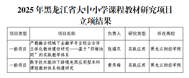 近日,黑龙江省教育厅公布了2025年黑龙江省大中小学课程教材研究立项结果,我校成功获批一般项目立项2项,并推荐参加教育部大中小学课程教材研究项目评选。