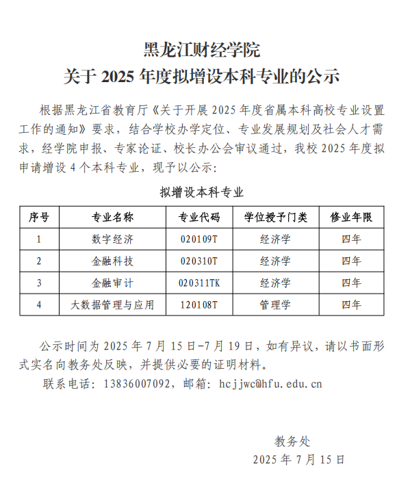 黑龙江财经学院关于2025年度拟增设本科专业的公示