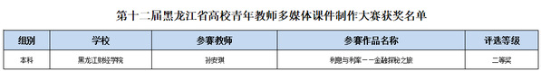 近日,第十二届黑龙江省高校青年教师多媒体课件制作大赛评选结果揭晓。金融学院教师孙安琪参赛作品“利息与利率——金融探秘之旅”荣获二等奖。