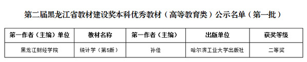 近日,第二届黑龙江省教材建设奖优秀教材(高等教育类)公示名单(第一批)揭晓。由管理学院教师孙佳主编的《统计学(第5版)》教材荣获第二届省教材建设奖优秀教材二等奖(第一批)。