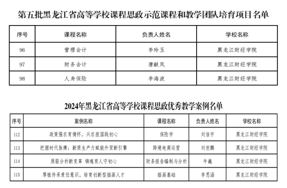 近日,省教育厅公布了黑龙江省高等学校第五批课程思政示范课程和教学团队培育项目、2024年课程思政优秀教学案例名单,我校3门课程荣获课程思政示范课程和教学团队、4项案例荣获课程思政优秀教学案例。
