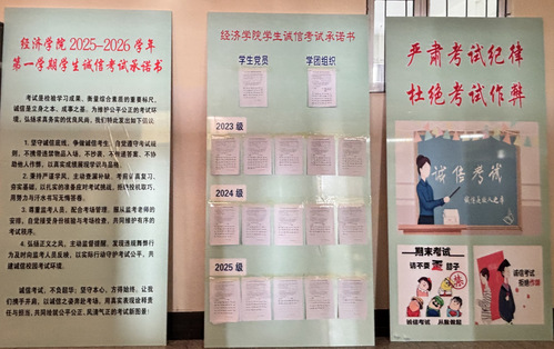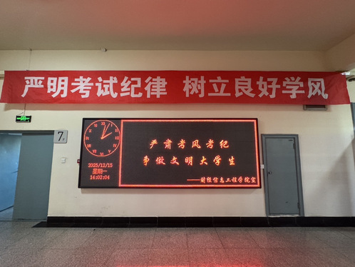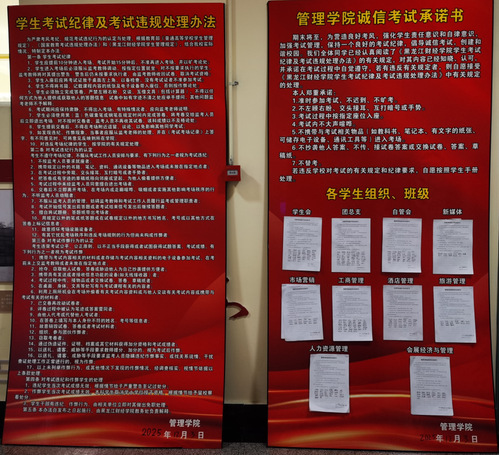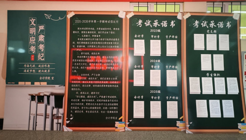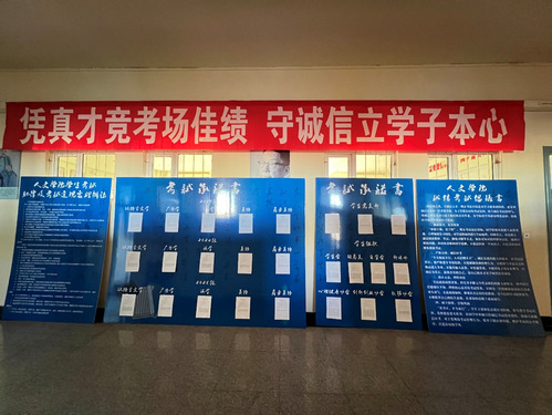 我校期末考试于12月1日全面启动,为保障期末考试工作平稳有序开展,正教风、肃考风、促学风,营造公平公正的考试环境,教务处组织召开了期末考试工作会议,统筹部署考务全流程工作,细化实施方案,并对命题、制卷及考场编排等关键环节严明规范。各院(部)积极落实,提前清扫考场、规整桌椅,创造整洁良好的考试环境;通过召开考前动员会、宣讲考试纪律、开展诚信教育并组织签署诚信承诺书等方式,引导学生端正考风;利用张贴主题板报与条幅等广泛宣传,营造严肃诚信的考试氛围。