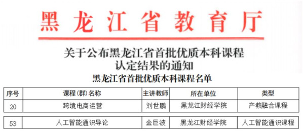近日,黑龙江省教育厅公布黑龙江省首批优质本科课程认定结果,我校刘世鹏教授主讲的《跨境电商运营》课程及金巨波教授主讲的《人工智能通识导论》课程成功入选。